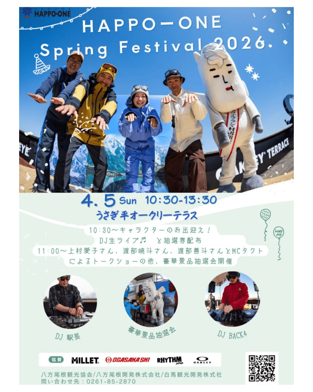 The Hakuba Happo-one Spring Festival 2026 is a celebratory season-end event on April 5th at the Usagidaira Oakley Terrace, featuring a talk show and raffle with winter sports legends Akito Watabe, Yoshito Watabe, and Aiko Uemura. Starting at 10:30 AM, attendees can enjoy live DJ sets, meet local mascots, and grab free refreshments while picking up tickets for a chance to win exclusive memorabilia, including a signed World Cup bib.